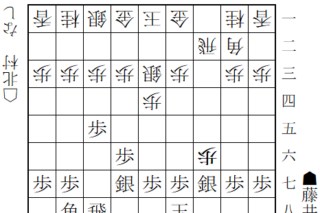戦型は藤井五段の四間飛車に堀口六段が右四間飛車と天守閣美濃の組み合わせと少し趣向を凝らしている。藤井五段は☗6七銀型で待機する姿勢で、右四間飛車を柔らかく受けようとしている。堀口六段は早く仕掛けず、米長玉銀冠まで組み上げ相銀冠になった。藤井五段がなかなか☗4七金としないところに右四間飛車の大捌きを警戒している意図がありそうだが、具体的な手順までは分からない。