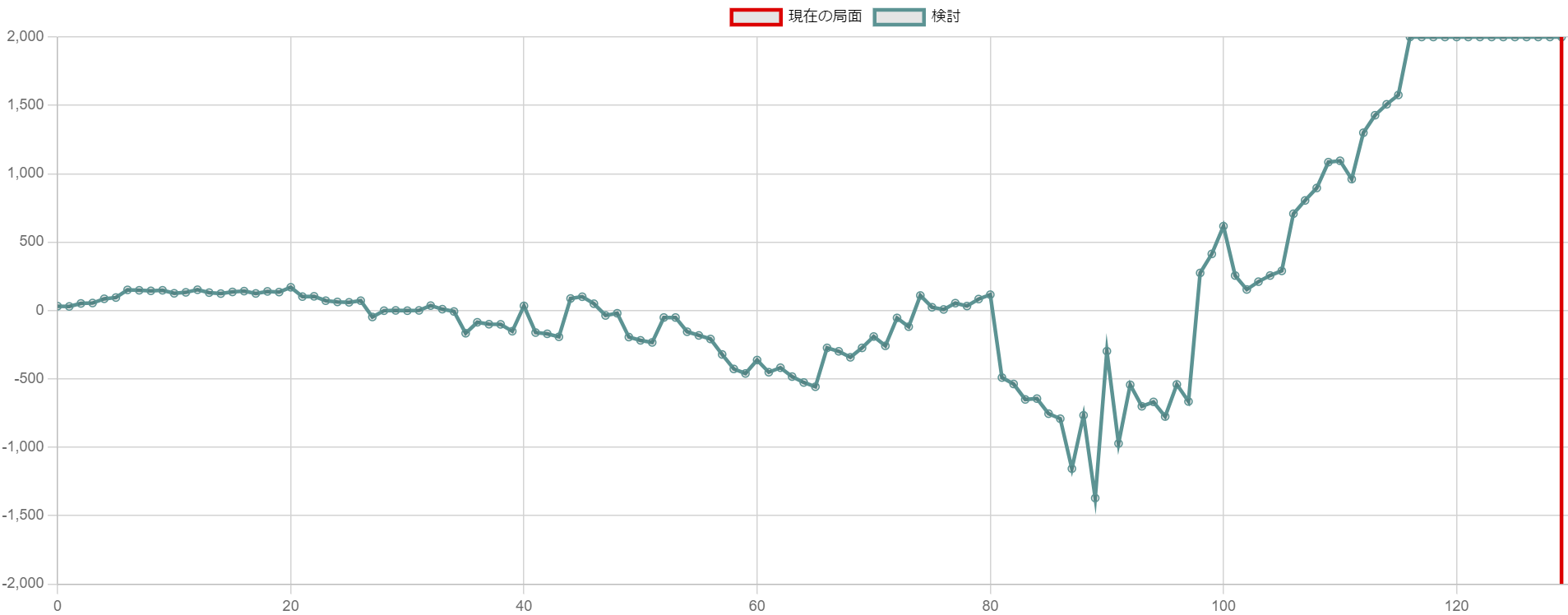 序盤はほぼ互角の状態で推移し、中盤からちょっとずつ後手に振れていた。大駒4枚渡ったところは後手が勝ちの数字になっているが、☖1八飛成で一気に先手に振れた。☖1八飛成が敗着だった。代えて☖4八角成~☖6三金という冷静な手が示されていた。この精神的な極限を迎えたような局面で、詰めろを掛けなくても良いという発想がなかった。☖4八角成を入れずに単に☖6三金は☗3六金と根元の桂を外すことができる。
