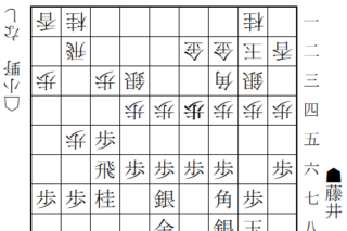 実際の進行は乱戦にならず穏やかな進行。藤井六段は金無双に構え向かい飛車に振り直してやや攻撃的な布陣、真部八段は向かい飛車に振り直されることを前提にやや厚みのある形に構えた。☖2四飛の形の時に☗3六歩として、玉頭の位を奪還しようとしている。