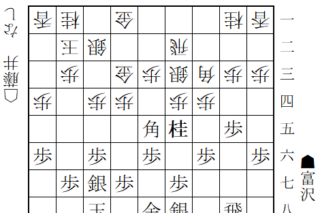 本局は山口七段の筋違い角。二人とも振り飛車党ではあるが、どうも相振り飛車や単純な対抗形にはならない。藤井六段は4筋と5筋に位を張る指し方で、約2年前の武市三郎五段戦(1994/1/24・棋王戦)と同様に進めていく。
