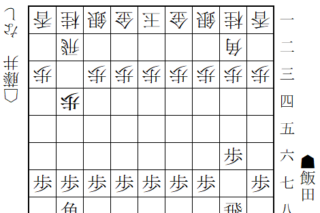 室岡六段との前回の戦いでは、室岡六段が居飛車穴熊を選択したが、本局では天守閣美濃。